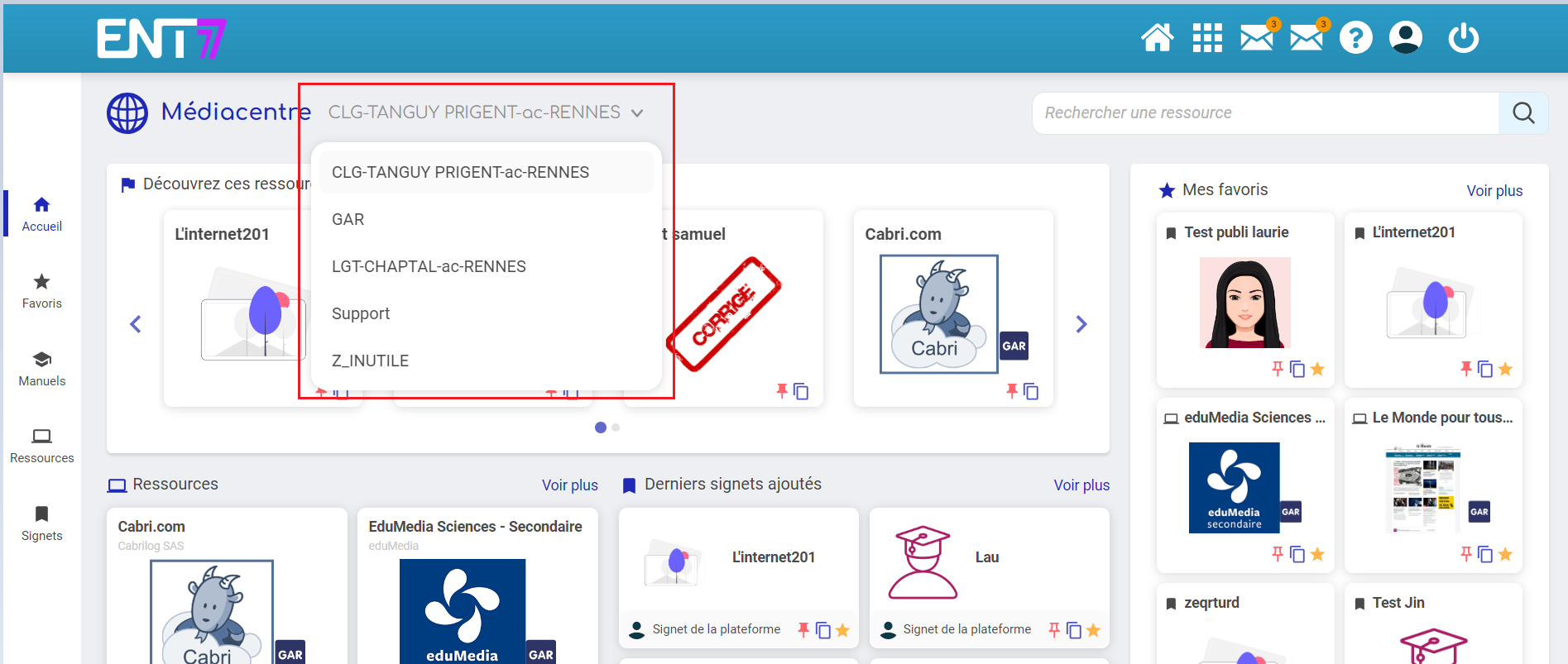 Et dans le cas où un utilisateur est affecté sur plusieurs établissements, il aura maintenant la possibilité de sélectionner l'établissement sur lequel il veut se situer, depuis la page d'accueil :