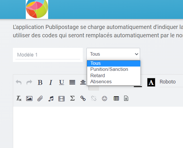 - Quand on crée un modèle de publipostage, il est désormais possible de l'associer à une catégorie. Cette catégorie sera récupérée au moment du publipostage pour ne proposer que les modèles liés à un type d'événements. Par exemple, si un modèle est associé à la catégorie "Absence", il n'apparaîtrait pas si on ne sélectionne que des retards ou des punitions.