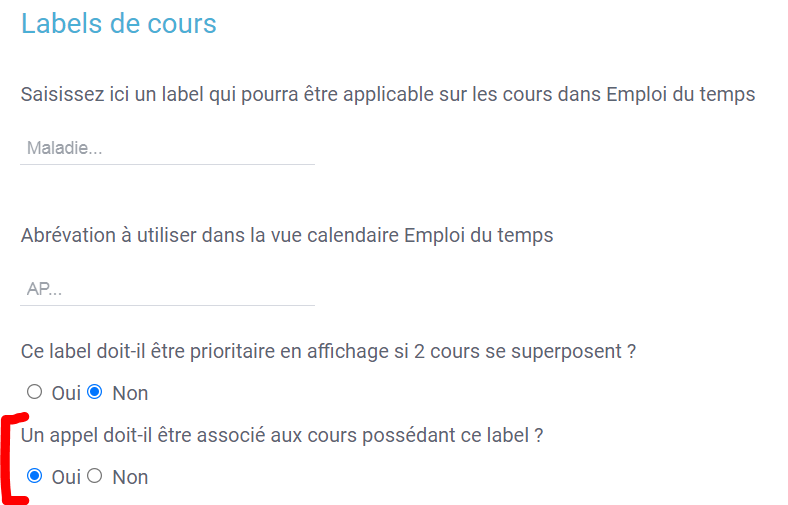 - Quand on crée un label de cours pour Emploi du temps, on peut décider que ce label ne créera pas d'appel dans Présences : cela permet notamment pour les cours annulés de ne pas avoir d'appels oubliés.