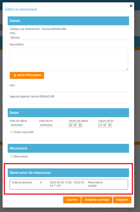 Une fois l'évènement enregistré avec ses ressources, la réservation est consultable et modifiable depuis l'application "Réservation de ressources".