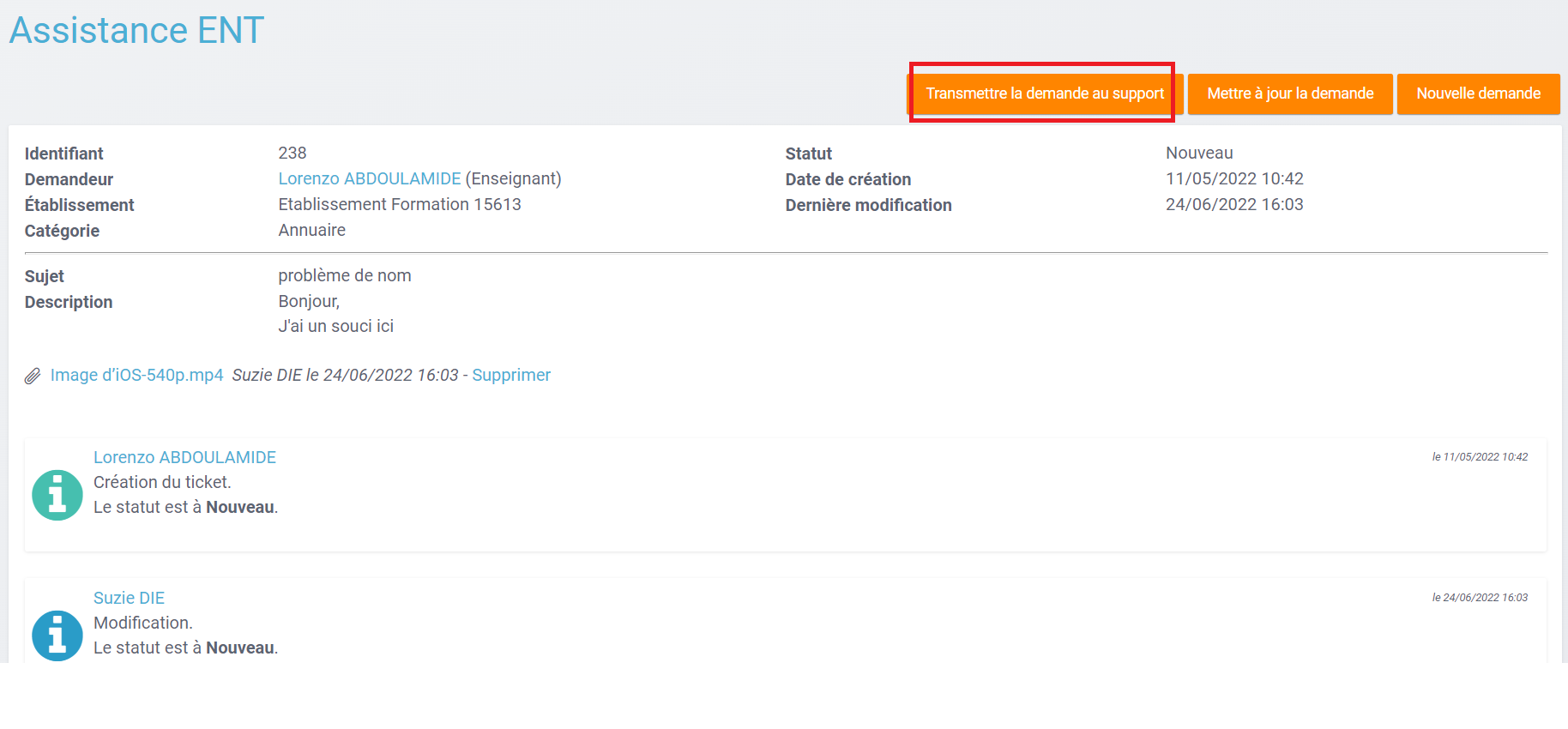 Il suffit aux ADMLs ayant ce droit, de cliquer sur le bouton "Transmettre la demande au support" pour que la demande soit créée sur JIRA.
