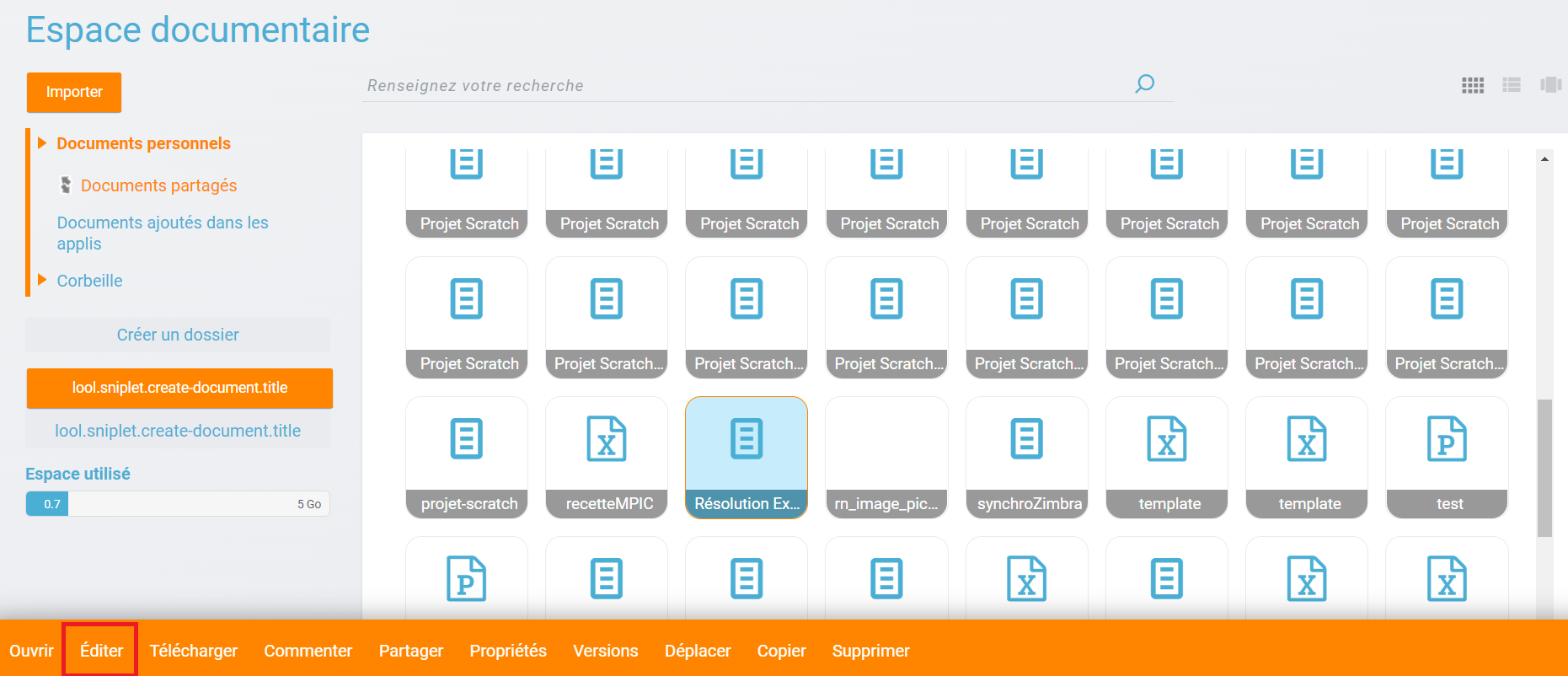 Il est maintenant possible depuis l'espace documentaire d'utiliser l'option "Editer" du bandeau orange lors de la sélection d'un projet Geogebra. Au clic sur cette option, un nouvel onglet apparait avec la fenêtre Geogebra et le projet correspondant.