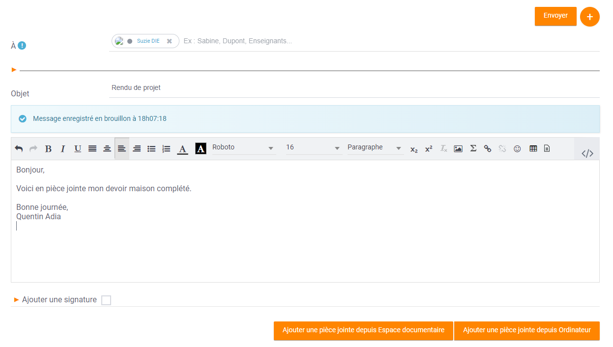 - Lors de la rédaction d'un message, il est désormais possible d'importer des pièces jointes depuis l'ordinateur ou depuis l'espace documentaire.