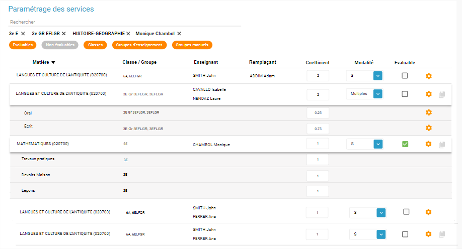 Dans l'onglet "Modalité des services", il est maintenant possible d'ajouter un coefficient à une sous matière pour un service