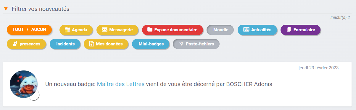 • Notifications : quand un utiliser se voit octroyer un badge, une notification apparaît sur son fil de nouveautés.