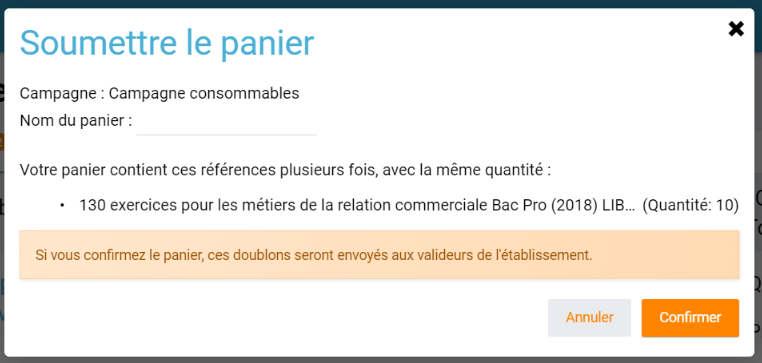 • CRRE-494, CRRE-495 : Signaler les doublons à la confirmation d'un panier (interface prescripteur) et d'une demande (interface valideur)