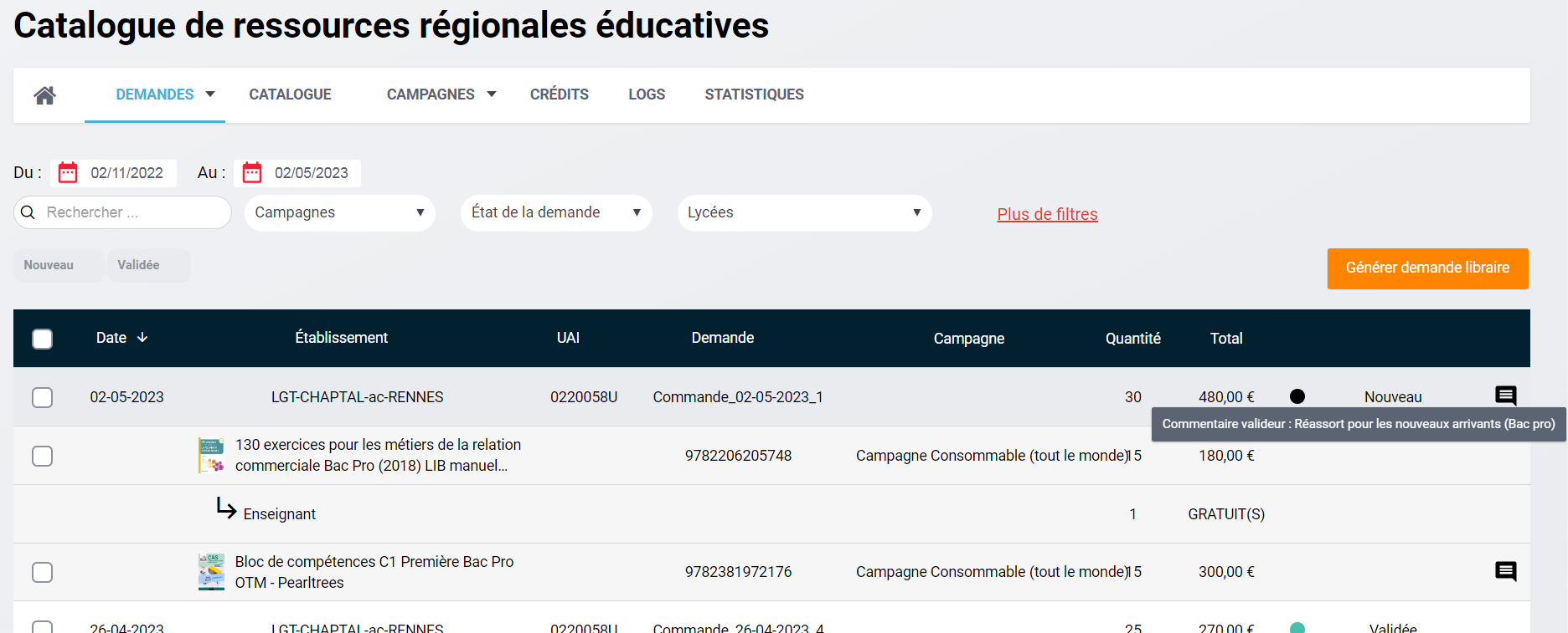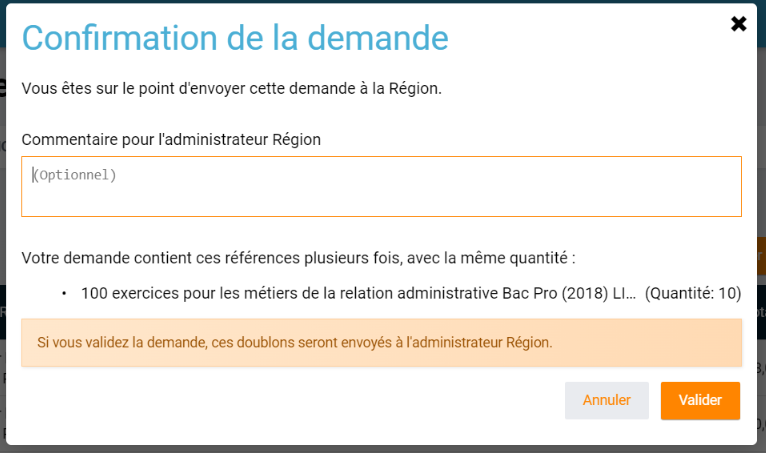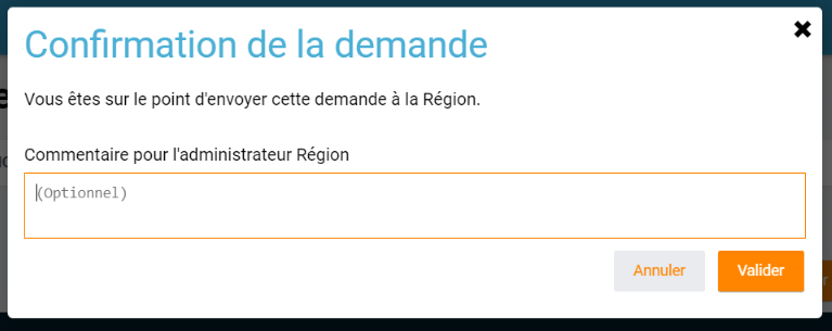 Les valideurs de CRRE ont désormais la possibilité de laisser un commentaire à destination de l'administrateur Région lorsqu'ils passent une commande :