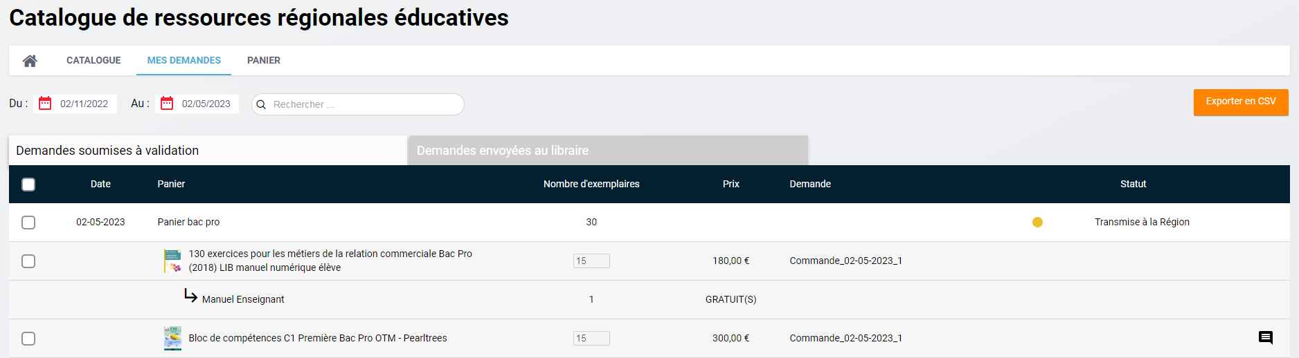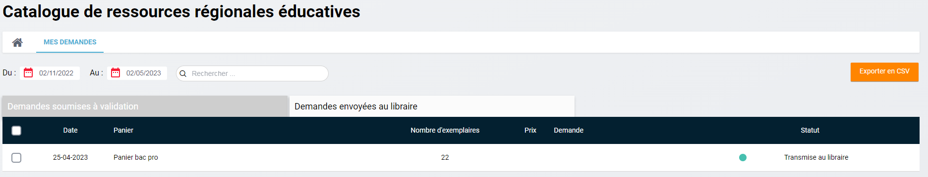 • CRRE-518 : Permettre l'export CSV des demandes transmises au libraire dans le "Tableau des demandes" (interface administrateur)