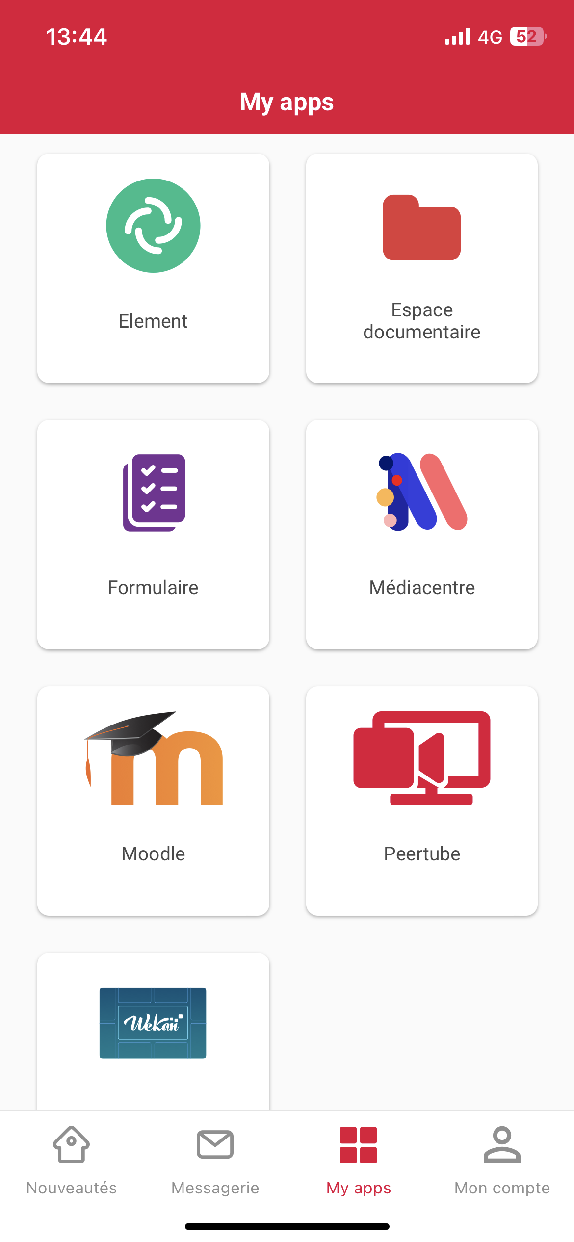 - Les connecteurs Wekan, Peertube, Element, Moodle sont désormais disponibles dans l'onglet "Mes applis" et s'ouvrent dans le responsive avec une authentification automatique. Si l'utilisateur a l'application Moodle dédiée, elle est ouverte automatiquement au clic sur l'application Moodle de l'application de l'ENT.