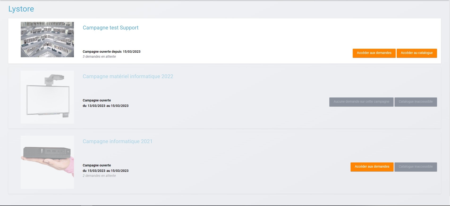 Depuis la page d'accueil de Lystore, cliquez sur le bouton "Accéder aux demandes" présent sur la campagne dont vous souhaitez consulter l'historique de vos demandes.