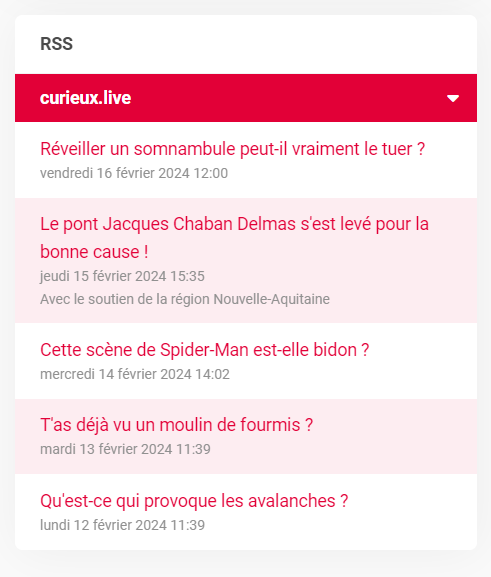 Une fois cette action effectuée, les utilisateurs de la plateforme retrouveront dans leur widget RSS, en plus des flux qu'ils ont eux-mêmes créés, ceux ajoutés par le super administrateur via l'appel API.